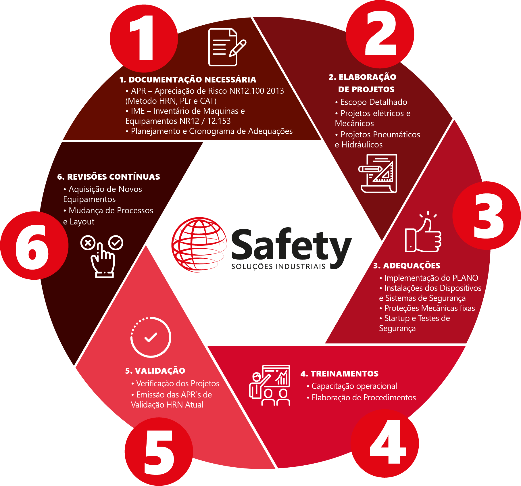 Todos os projetos de sistemas de segurança em máquinas elaborados, desenvolvidos e executados pela Safety atendem às Normas Regulamentadoras em sua plenitude, destacando a NR-12 e NR-10, bem como as normas técnicas oficiais vigentes nacionais, e na falta dessas, as normas técnicas internacionais aplicáveis.